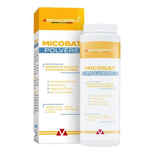 BRADERM Micobat CremaDescrizione Prodotto usato per il trattamento e la prevenzione di: intertrigini, sudamine, dermatiti pruriginose delle pieghe, macerazioni, iperidrosi palmo plantare, tinea pedis e corporis, eritema da pannolino. Grazie alla presenza di Corexidina, Ossido di Zinco, Bisabololo, Burro di Karité, Biossido di Silicio, aiuta a ripristinare le condizioni fisiologiche della cute. Ingredienti Ciclopirox Olamina, Zinco Piritione, Clorexidina, Biossido di Silicio, Ossido di Zinco, Bisabololo, Burro di Karitè. Modalità d'uso Dopo aver deterso la cute, applicare 1/2 volte al giorno per almeno 1 mese. Conservazione ...